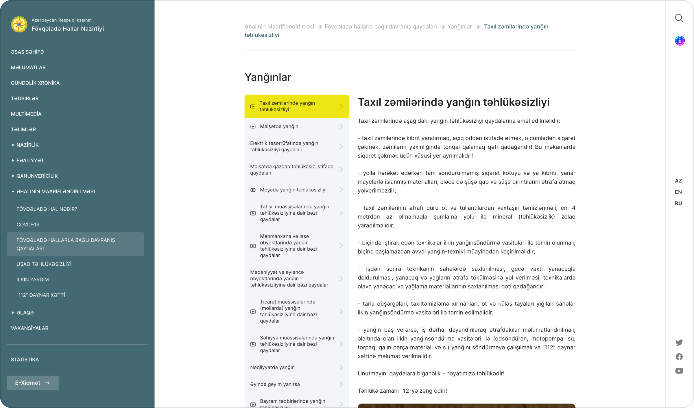 Bundan əlavə, portal fövqəladə hallara hazırlıq, əməliyyat məlumatları, vətəndaş yardımı xətləri, statistik hesabatlar və ən son yeniliklər kimi müxtəlif informasiya növlərini vahid mənbədə toplayaraq istifadəçilərin ehtiyaclarını sistemli şəkildə ödəməyi hədəfləyir. Məqsəd həm şəxsi hazırlıq və təhlükəsizlik biliklərini artırmaq, həm də fövqəladə hallar zamanı operativ xəbərdarlıq sistemini gücləndirməkdir.