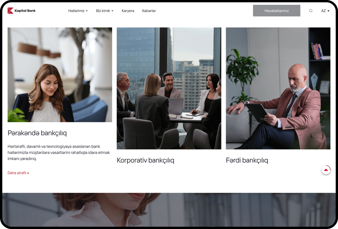 Layihənin dizayn və funksionallığı müasir rəqəmsal standartlara cavab verir. Sayt mobil və desktop cihazlarda tam uyğun şəkildə işləyir, aydın naviqasiya və sürətli cavab müddəti ilə istifadəçi təcrübəsini yaxşılaşdırır. Kapital Bankın rəqəmsal təqdimatı müştərilərin xidmətləri rahat tapmasına və bank əməliyyatlarını etibarlı şəkildə həyata keçirməsinə imkan verir.