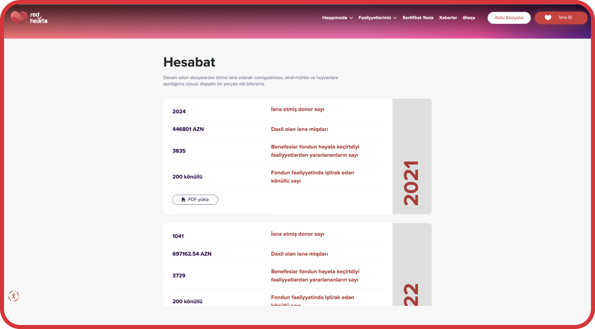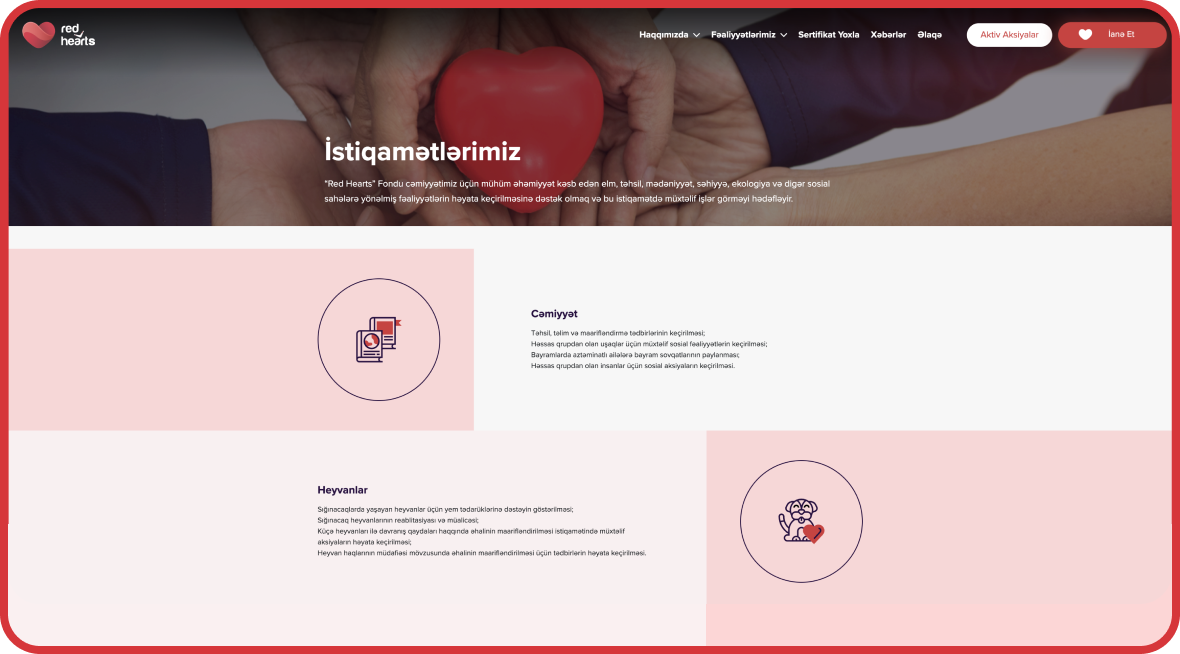 Layihədə əsas diqqət istifadəçiyə sadə, rahat və cəlbedici rəqəmsal təcrübə təqdim etməyə yönəldilib. Saytın strukturu mövcud və potensial müştərilərin proqramda iştirakını asanlaşdırmaq üçün aydın naviqasiya və effektiv vizual dil ilə qurulub. Red Hearts platforması yalnız bir bonus sistemi deyil, həm də istifadəçilərlə brend arasında emosional bağ yaradan rəqəmsal məkandır.