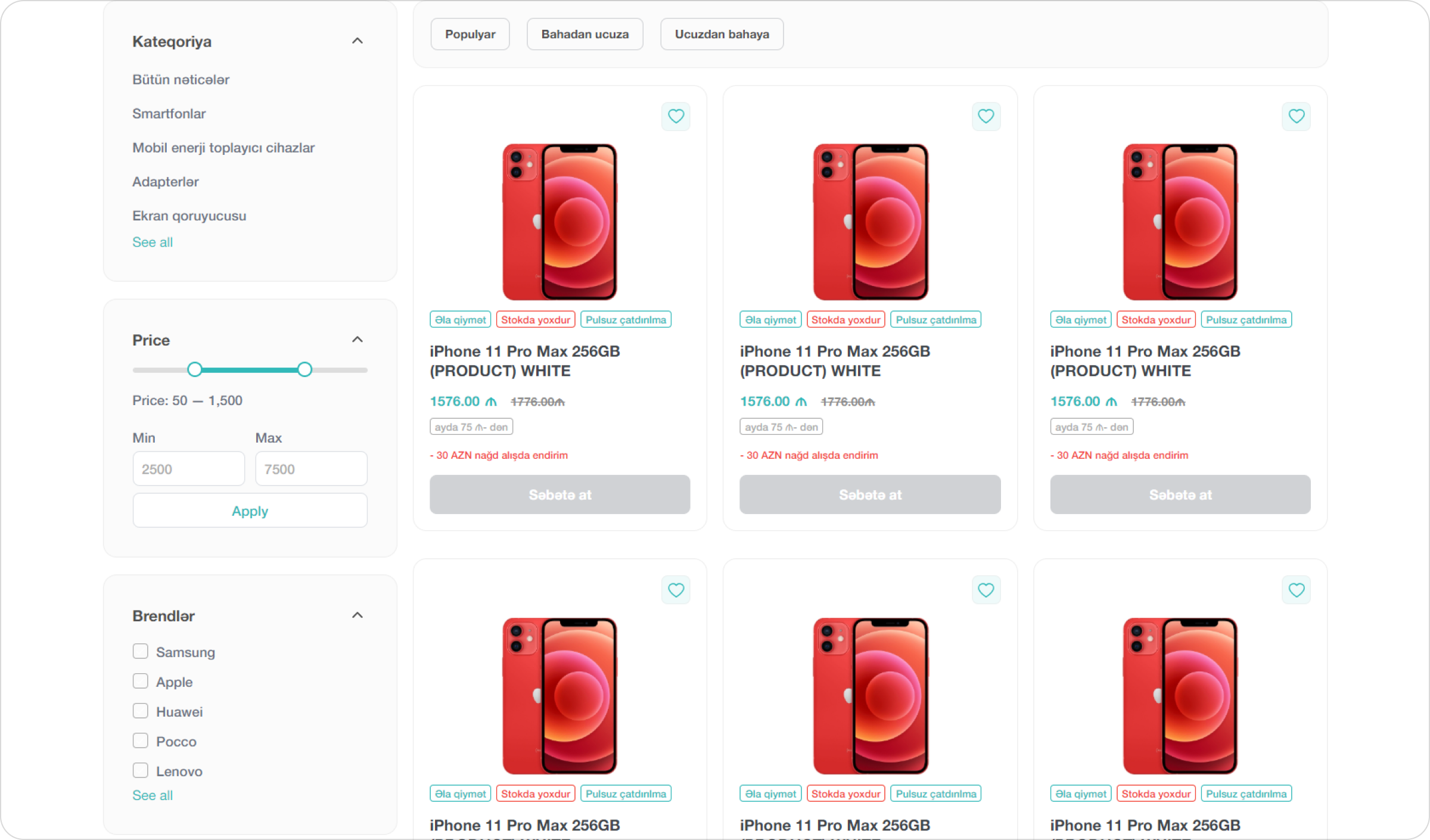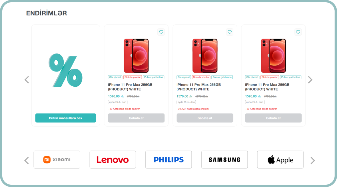 Bu layihədə sürətli yüklənmə, adaptiv dizayn və mobil optimizasiya əsas öncəliyimiz oldu. İstifadəçilər məhsulları rahatlıqla araşdıra, çeşidləyə və səbətə əlavə edə bilirlər. Sadə ödəniş prosesi, müxtəlif filtrasiya imkanları və istifadəçi hesabı modulu satış prosesini daha səmərəli hala gətirir.