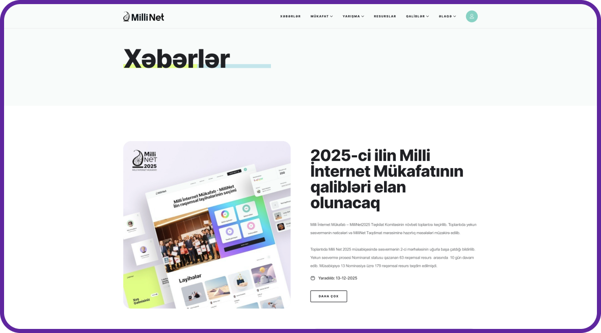 millinet.az vasitəsilə təşkil olunan Milli İnternet Mükafatı ölkədə internet sahəsində peşəkar mükafat geleneğini gücləndirib və ilbəil daha çox rəqəmsal layihəni cəlb edir. Hər il yüzlərlə resurs müsabiqəyə təqdim edilir, müxtəlif nominasiyalar üzrə qiymətləndirilir və seçilmiş layihələr qalib elan olunur.