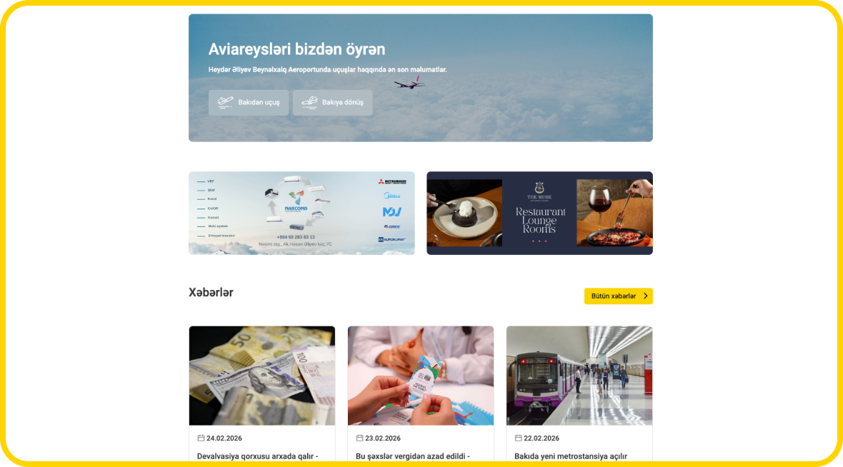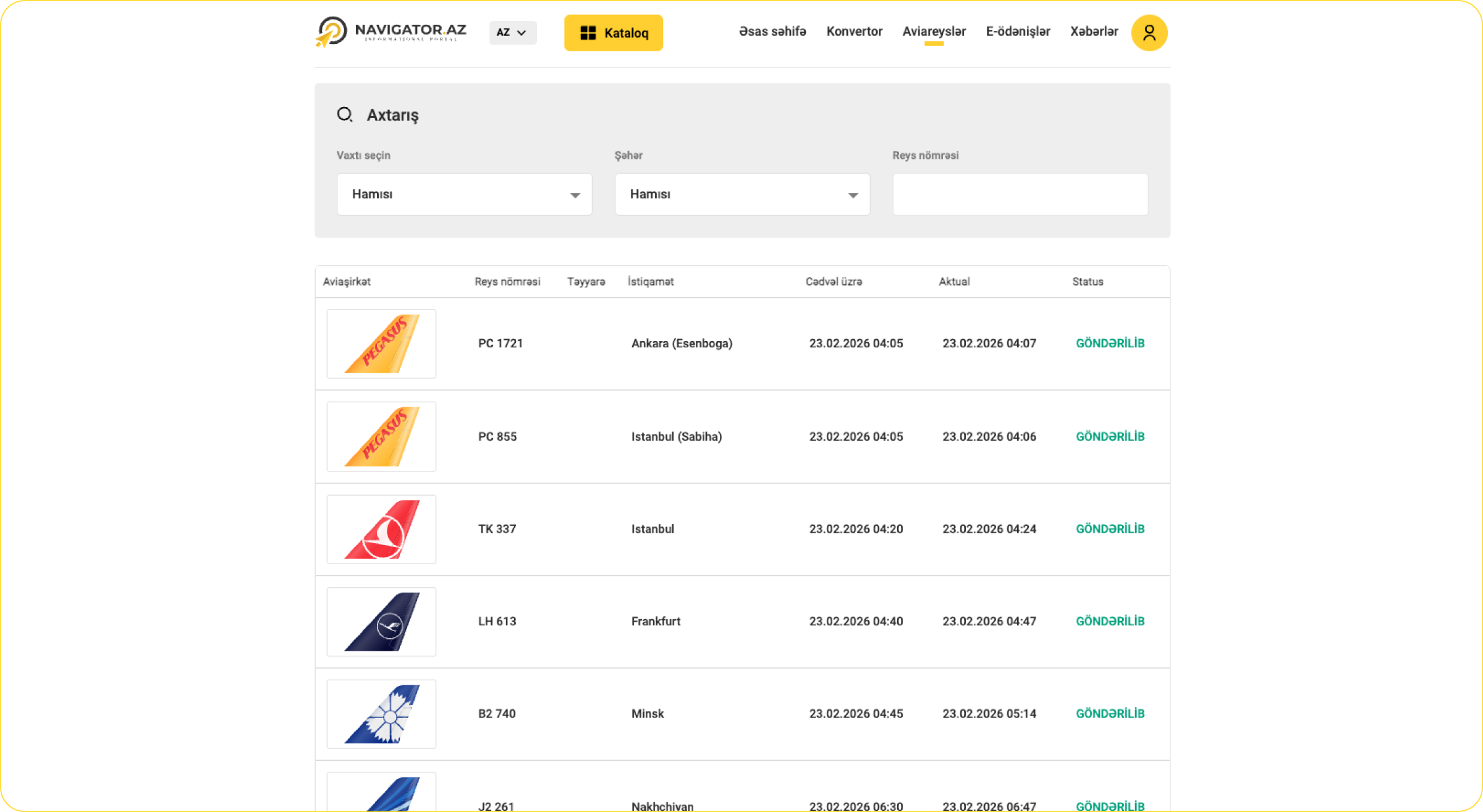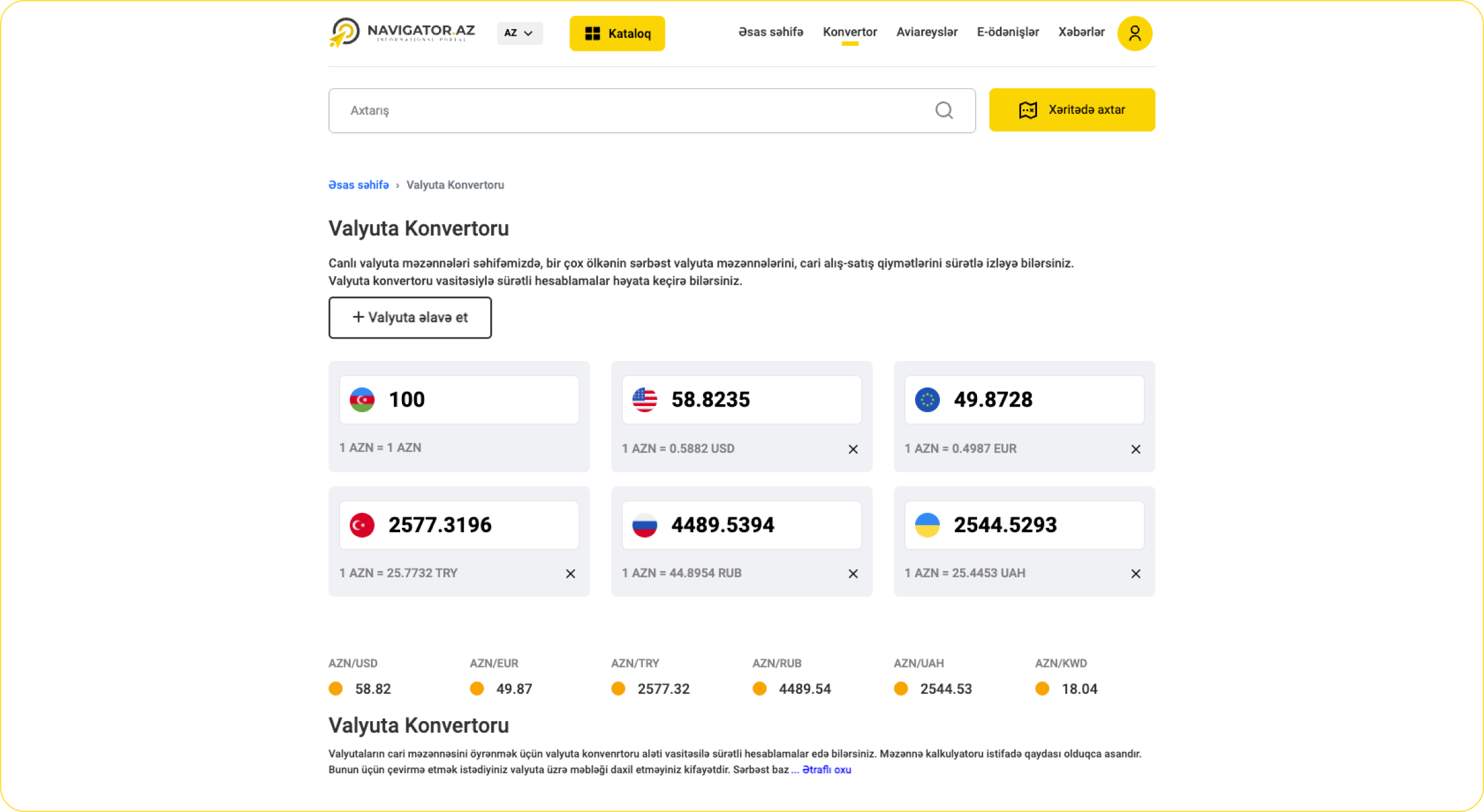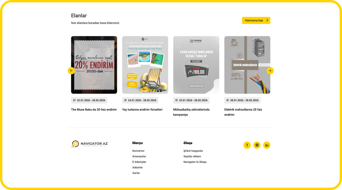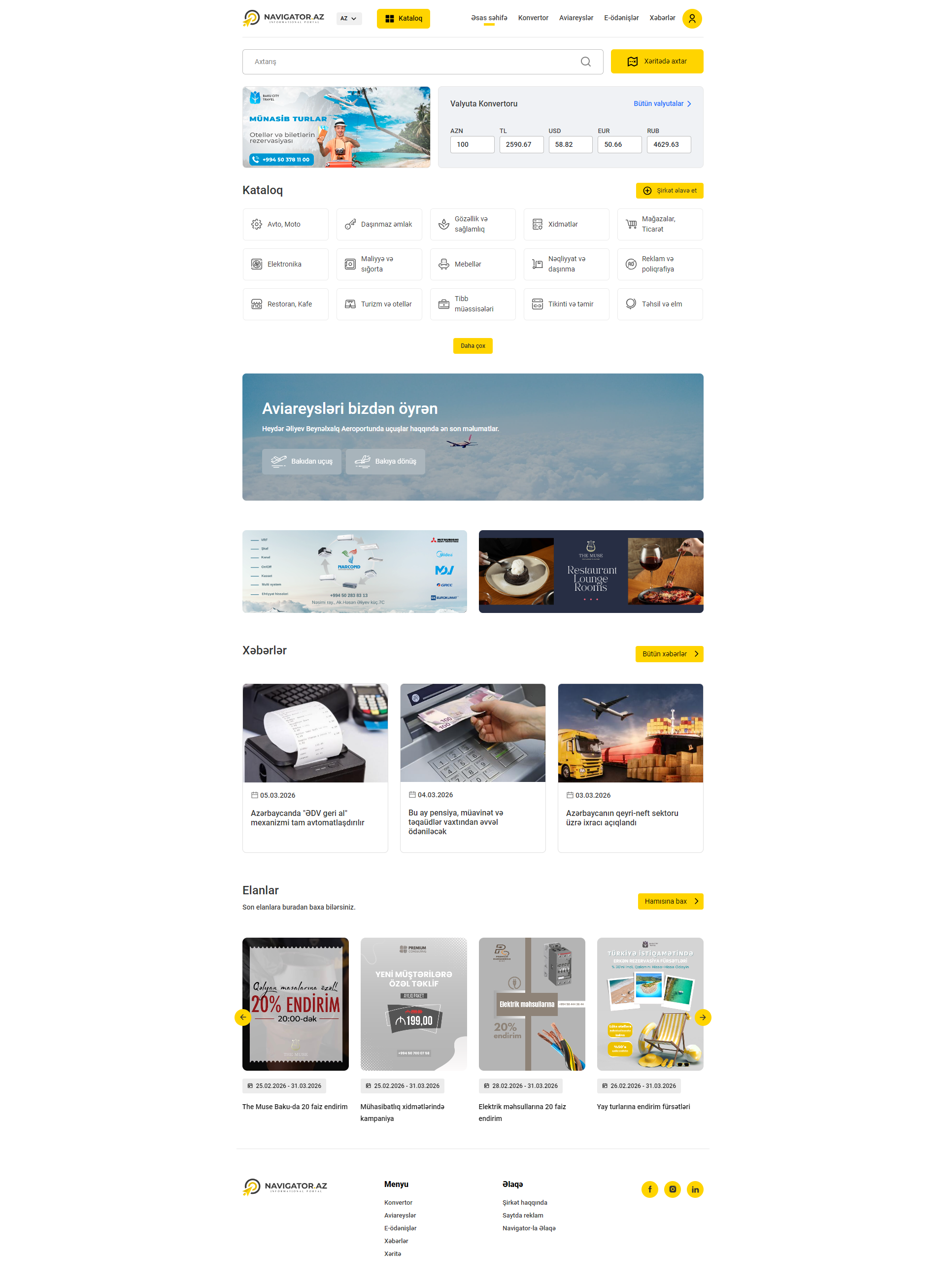 Navigator.az müxtəlif xidmət və məlumatları bir araya gətirən informativ rəqəmsal platformadır. Sayt vasitəsilə istifadəçilər müxtəlif sahələr üzrə məlumatlara və xidmətlərə rahat şəkildə çıxış əldə edə bilirlər. Platforma məlumatların strukturlaşdırılmış və istifadəçi yönümlü formada təqdim olunması məqsədilə hazırlanmışdır.