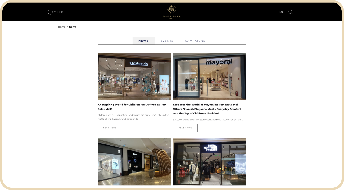 Portalın mobil uyğunluğu və sürətli performansı sayəsində istifadəçi məmnuniyyəti yüksək səviyyədədir və platforma Port Baku Mall‑ın əsas informasiya mənbəyi kimi qəbul olunur. Bu layihə müasir alış‑veriş mərkəzi üçün effektiv rəqəmsal resurs nümunəsidir və brendin rəqəmsal dünyadakı mövqeyini möhkəmləndirir.