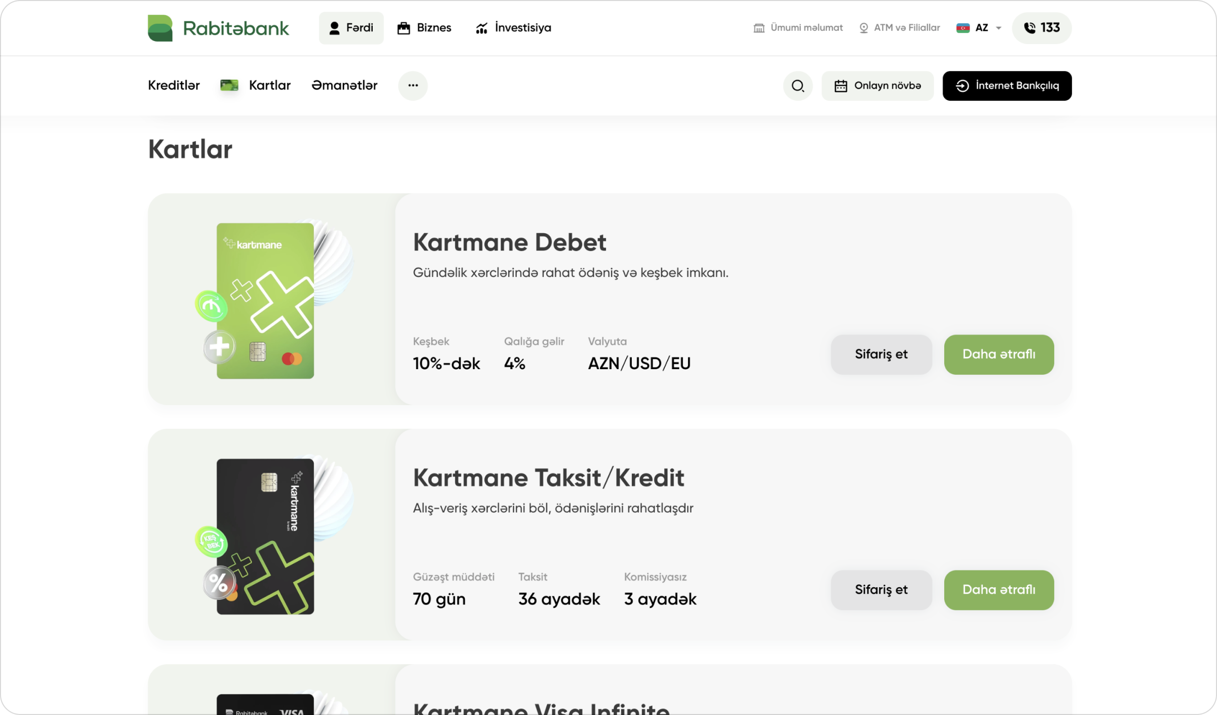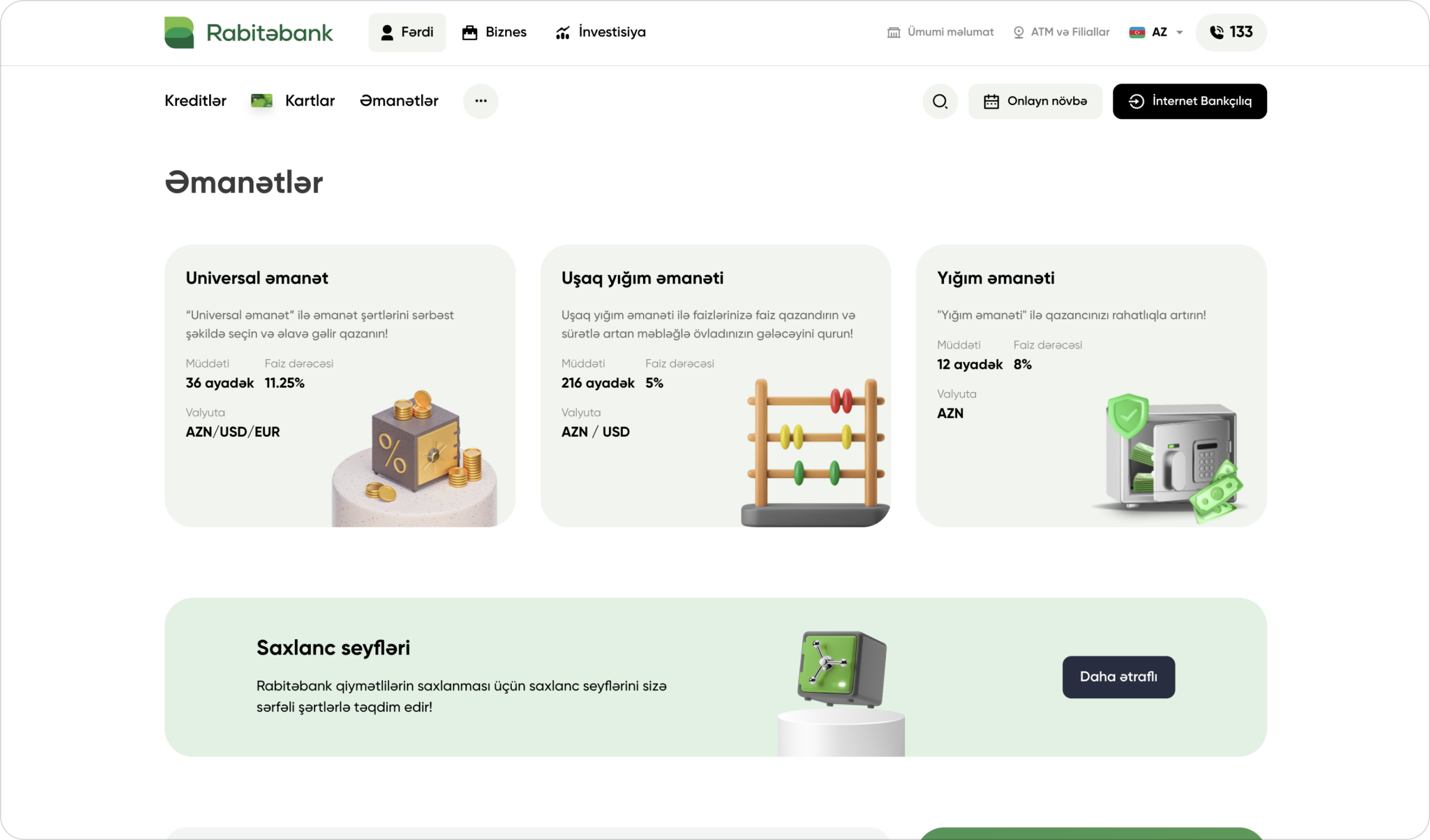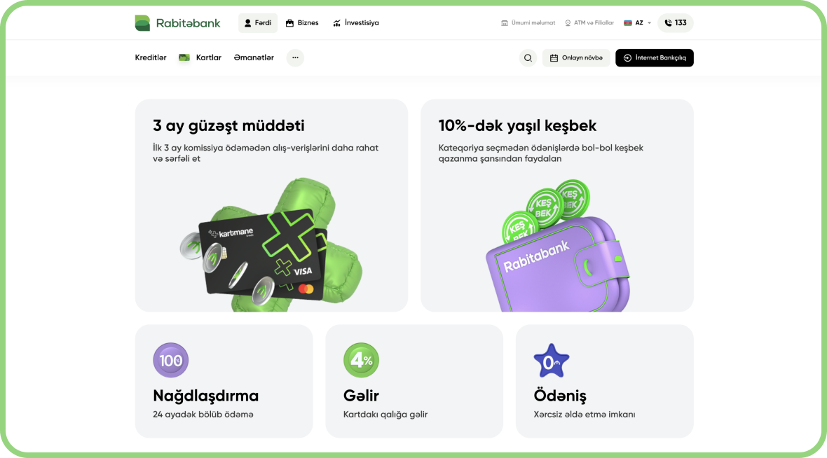 Rabitabank.com – Rabitabank ASC-nin rəsmi onlayn platforması olaraq, bankın məhsul və xidmətlərini müştərilərə daha rahat çatdırmaq məqsədi ilə yenilənmiş və tam funksional şəkildə istifadəyə verilib. Yeni sayt həm mobil, həm də masaüstü cihazlara uyğun şəkildə hazırlanıb və istifadəçilərə sadə interfeys vasitəsilə istədikləri bank əməliyyatlarını asanlıqla tapmaq imkanı verir.