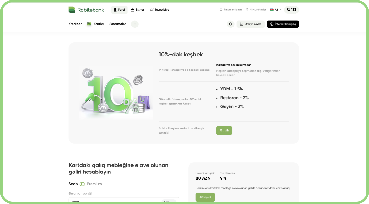Sayt üzərindən kredit məhsulları, depozitlər, kartlar, rəqəmsal bank xidmətləri, kampaniyalar və filial şəbəkəsi ilə bağlı ətraflı məlumat əldə etmək mümkündür. Eyni zamanda, onlayn müraciət, kredit kalkulyatoru və internet bankçılıq keçidləri də saytın funksionallığını artırır. Müştərilərin ehtiyacları nəzərə alınaraq sayt sürətli yüklənən, intuitiv və aydın struktura malikdir.