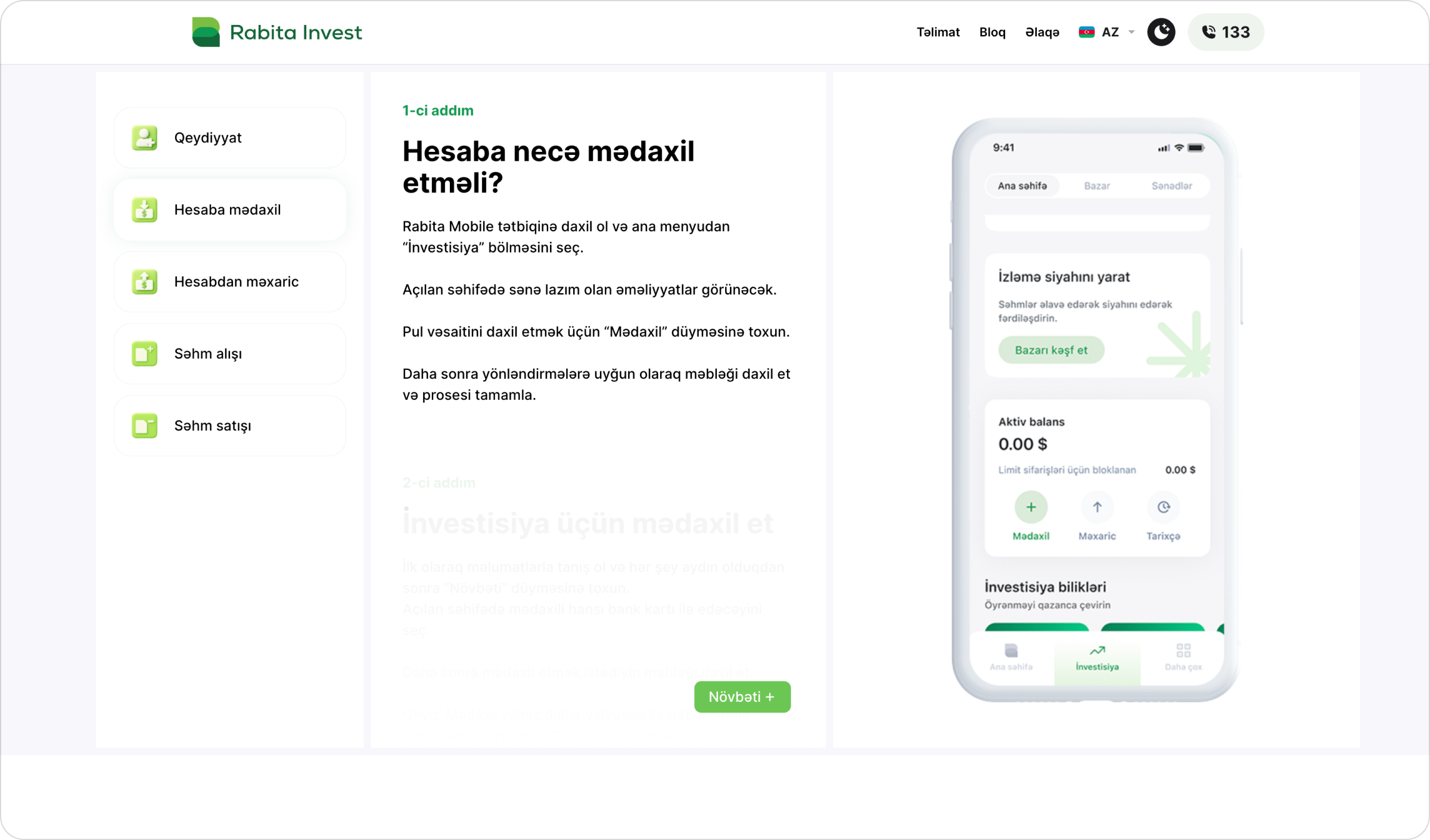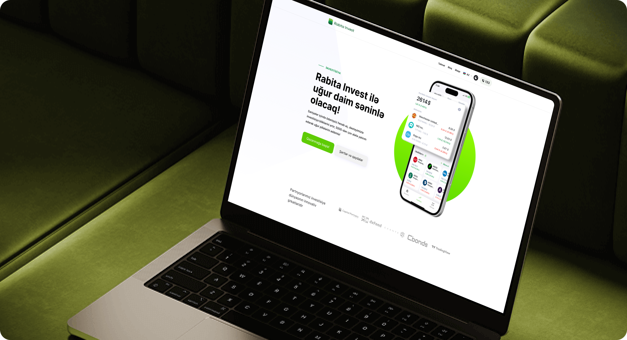 Rabitabank Invest – Rabitabank-ın investisiya xidmətlərini təqdim etmək üçün hazırlanmış xüsusi platformadır. Sayt istifadəçilərə yerli və beynəlxalq bazarlarda sərmayə imkanlarını araşdırmaq, məhsullarla tanış olmaq və investisiya üzrə mütəxəssislərlə birbaşa əlaqə qurmaq imkanı yaradır. Platforma həm fərdi investorlar, həm də müəssisələr üçün nəzərdə tutulmuşdur.