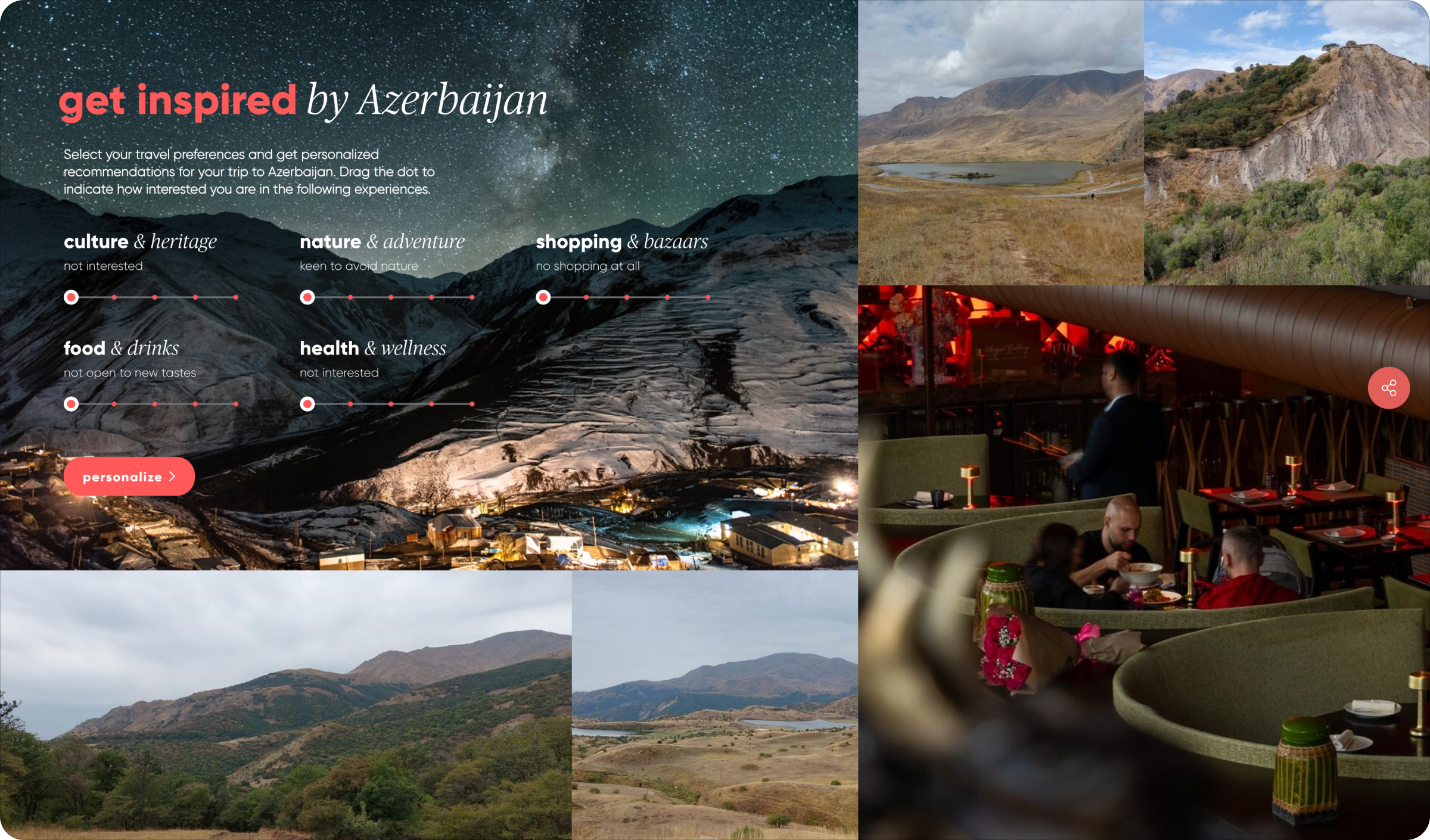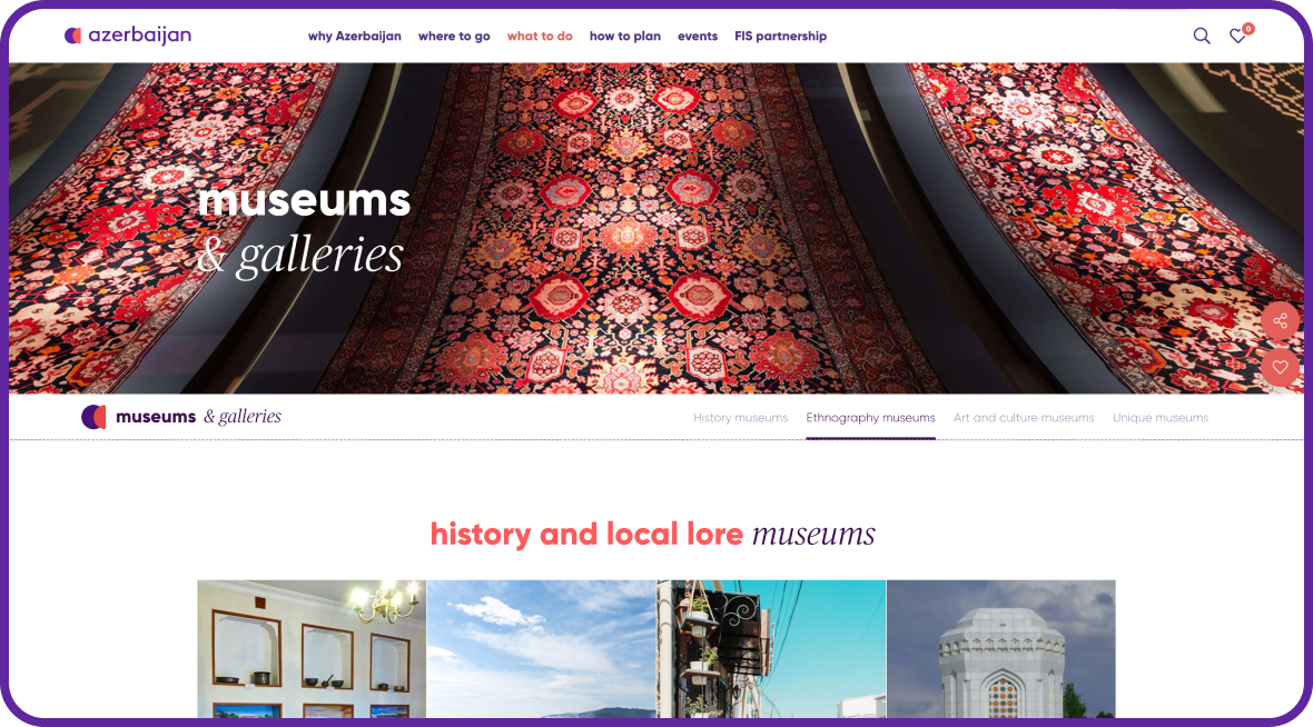 azerbaijan.travel — Azərbaycanın rəsmi Turizm Board portalıdır və ölkənin turizm potensialını həm yerli, həm də beynəlxalq səviyyədə tanıtmaq məqsədi ilə yaradılıb. Bu platforma ziyarətçilərə ölkənin mədəniyyəti, tarixi, təbiəti və səyahət imkanları haqqında ətraflı və sistemli məlumatlar təqdim edir. Sayt dinamik vizual elementlər, zəngin media məzmunu və intuitiv naviqasiya ilə istifadəçini cəlb edən rəqəmsal təcrübə yaradır.