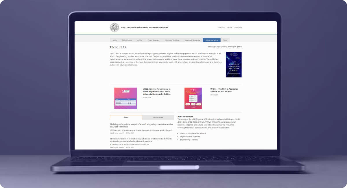 UNEC Journal of Engineering and Applied Sciences UNEC-in nəzdində fəaliyyət göstərən elmi jurnal üçün hazırlanmış platformadır. Saytda jurnalın buraxılışları, elmi məqalələr, müəlliflər üçün qaydalar və akademik məlumatlar təqdim olunur. Platforma elmi məqalələrin və tədqiqatların oxuculara əlçatan şəkildə təqdim olunmasını təmin edir.