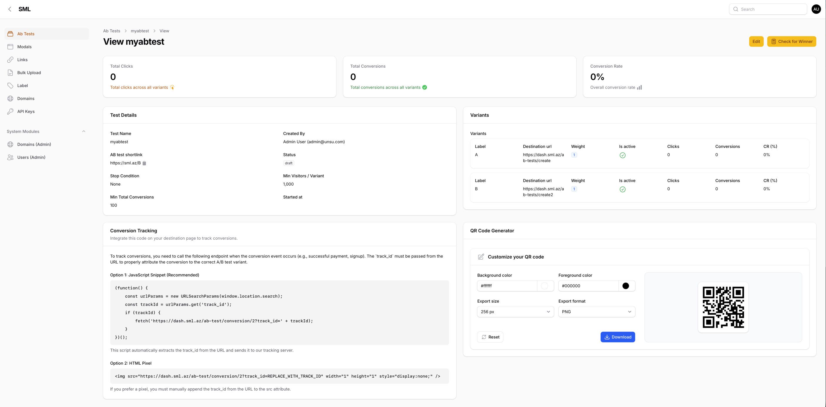Marketinq kampaniyalarının effektivliyini artırmaq üçün A/B test (split testing) funksiyası böyük əhəmiyyət daşıyır. Platformamız sizə eyni qısa link üçün bir neçə fərqli istiqamət (destination) təyin etməyə və istifadəçiləri bu variantlar arasında avtomatik bölüşdürməyə imkan verir.