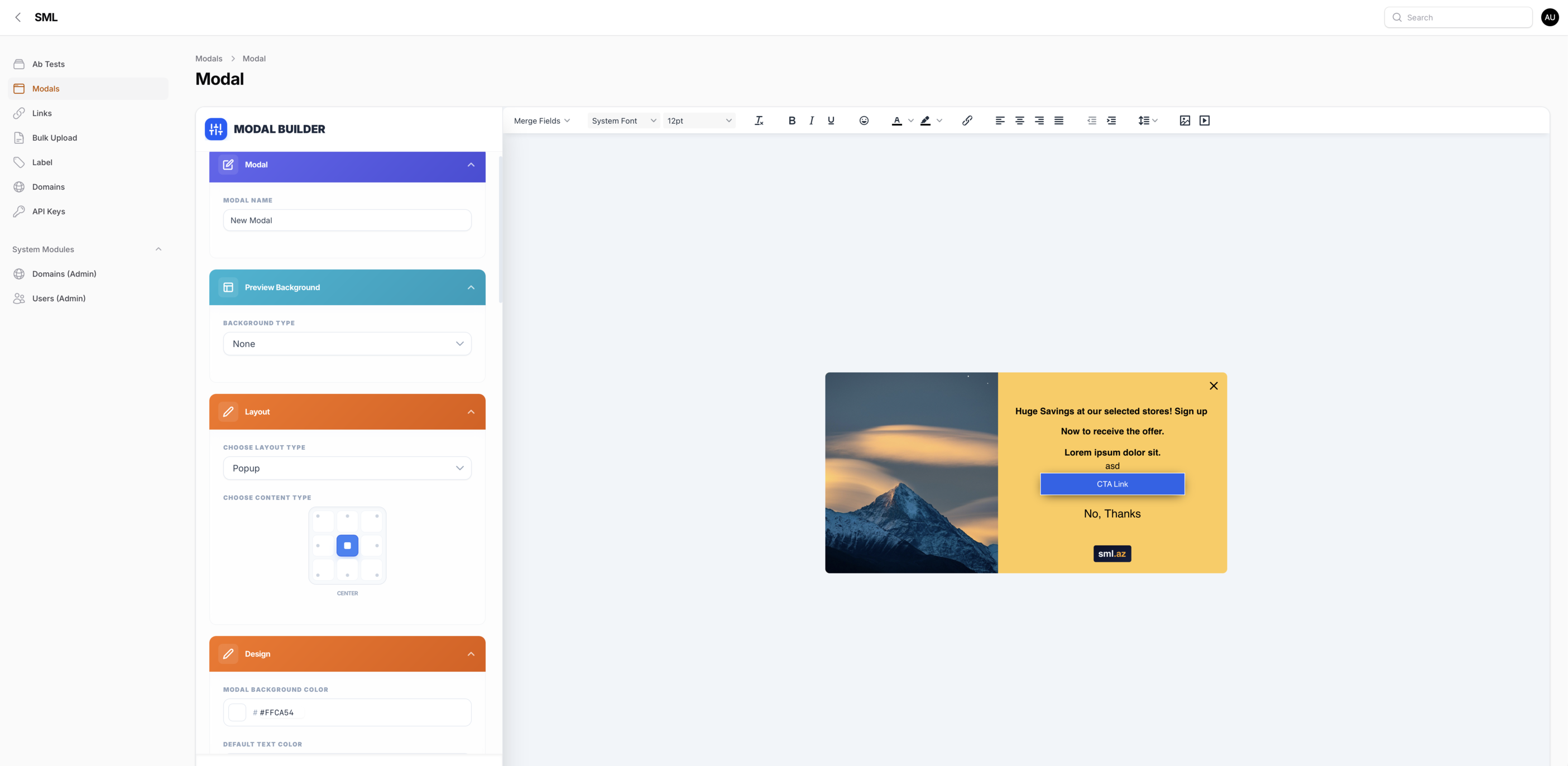Paneldə yerləşən Modal Builder vasitəsilə istifadəçilər popup-ları kod yazmadan hazırlaya bilirlər.